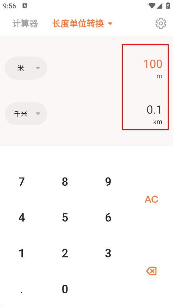 4、確認(rèn)輸入數(shù)值后,計(jì)算器自動(dòng)將米轉(zhuǎn)換為千米,顯示對(duì)應(yīng)結(jié)果,完成單位轉(zhuǎn)換操作。