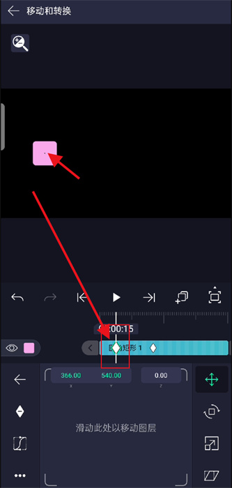 4、緊接著,將圓角矩形也移動(dòng)到需要的地方,繼續(xù)設(shè)置結(jié)束關(guān)鍵幀;