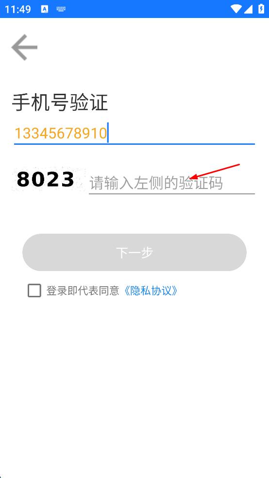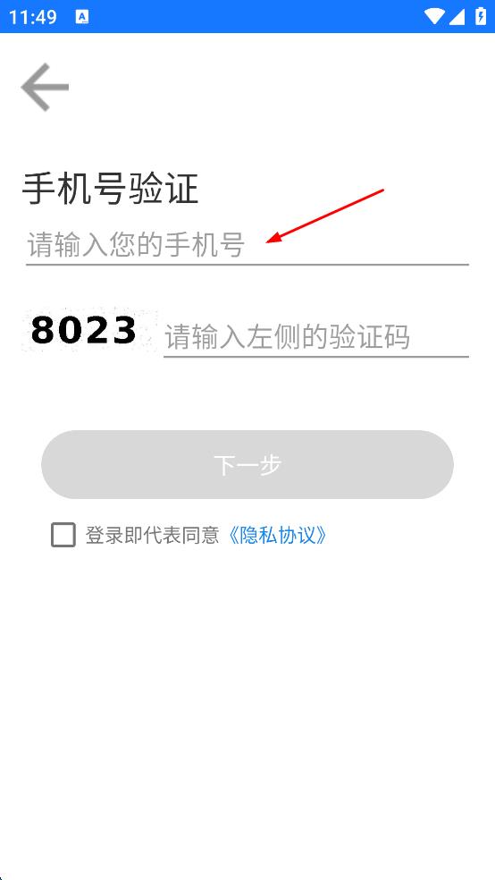 2、在手機(jī)號(hào)驗(yàn)證界面輸入手機(jī)號(hào)碼和驗(yàn)證碼,勾選登錄即代表同意隱私協(xié)議,點(diǎn)擊下一步。