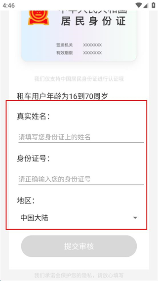4、在實(shí)名認(rèn)證界面輸入真實(shí)姓名、身份證號(hào),選擇地區(qū),點(diǎn)擊提交審核。