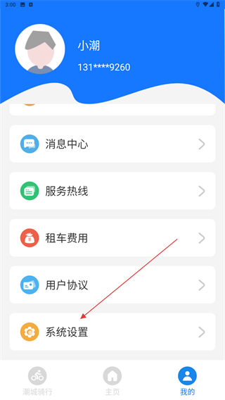 1、打開潮城騎行APP,在首頁導(dǎo)航欄中點(diǎn)擊我的按鈕。