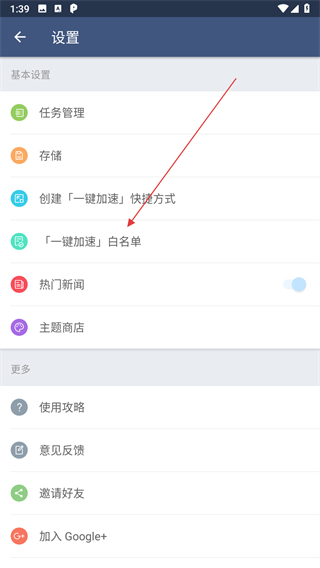 3、在設(shè)置界面里,找到一鍵加速白名單選項(xiàng)并點(diǎn)擊,進(jìn)入白名單管理頁面。