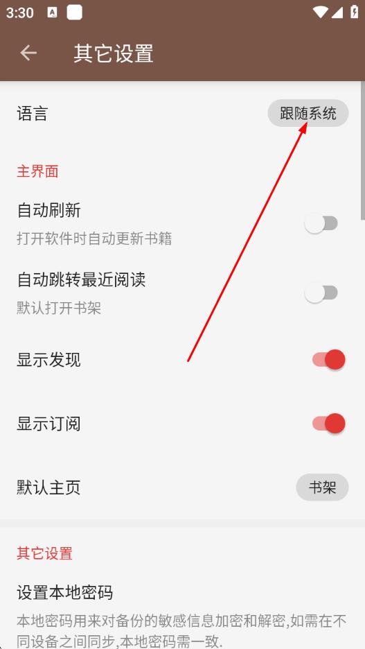 3、進(jìn)入其它設(shè)置頁面后,點(diǎn)擊語言選項(xiàng)右側(cè)顯示跟隨系統(tǒng)的灰色按鈕。