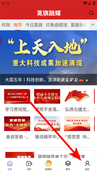 1、打開(kāi)莫旗融媒APP首頁(yè),點(diǎn)擊底部導(dǎo)航欄的我的,進(jìn)入個(gè)人頁(yè)面。