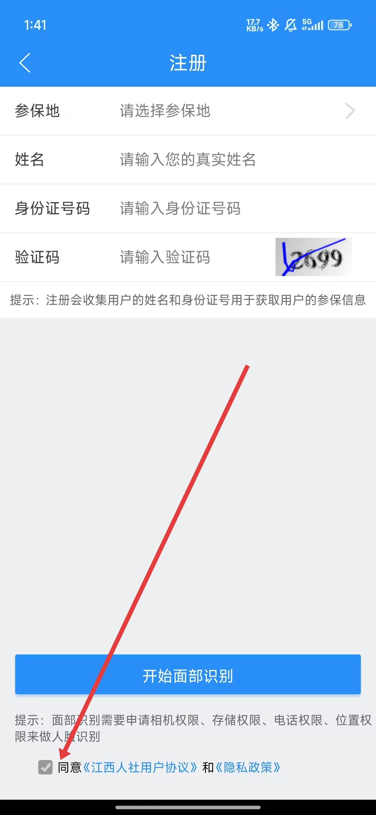 1、在進(jìn)入到注冊頁面后,先需要點擊方框勾選同意按鈕。