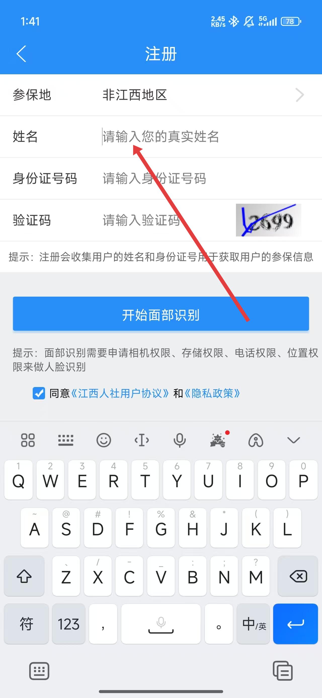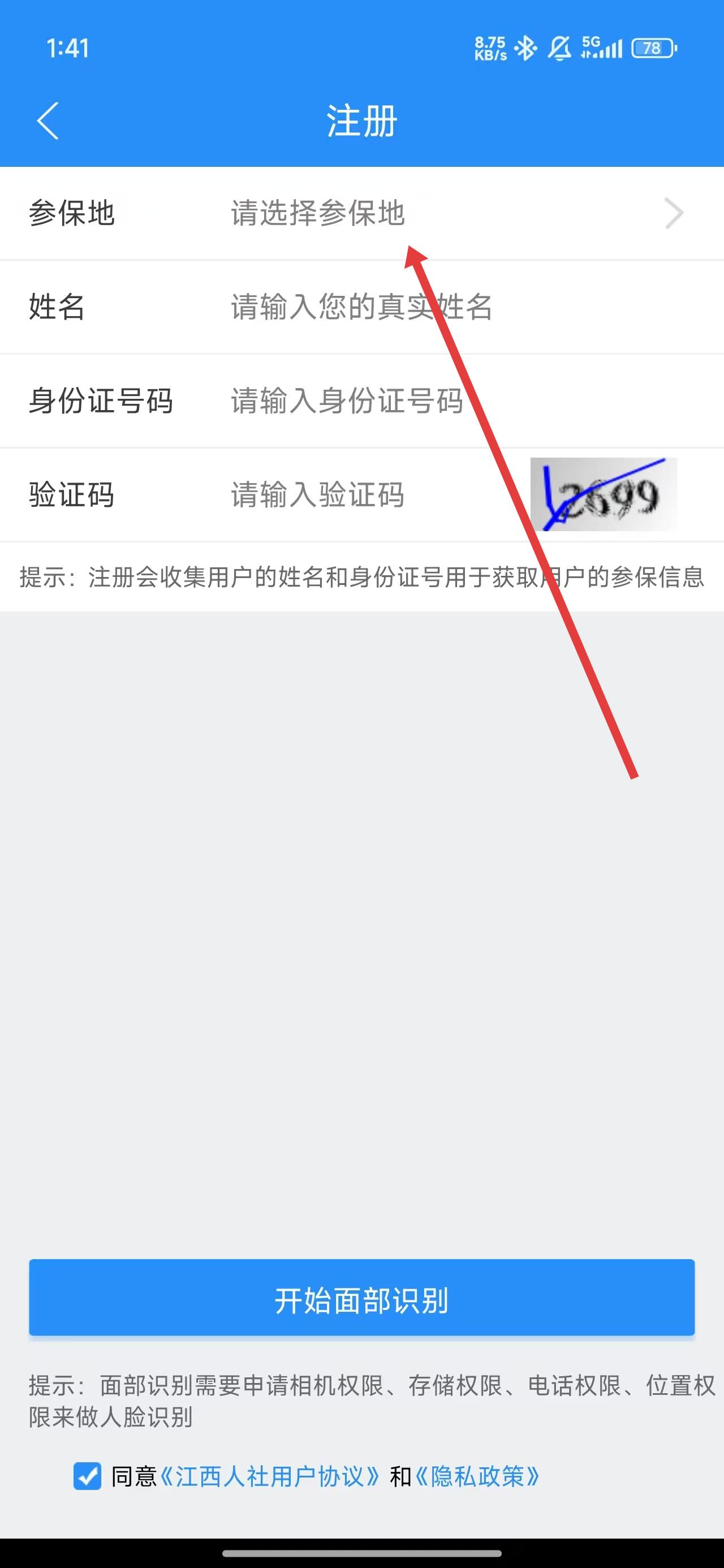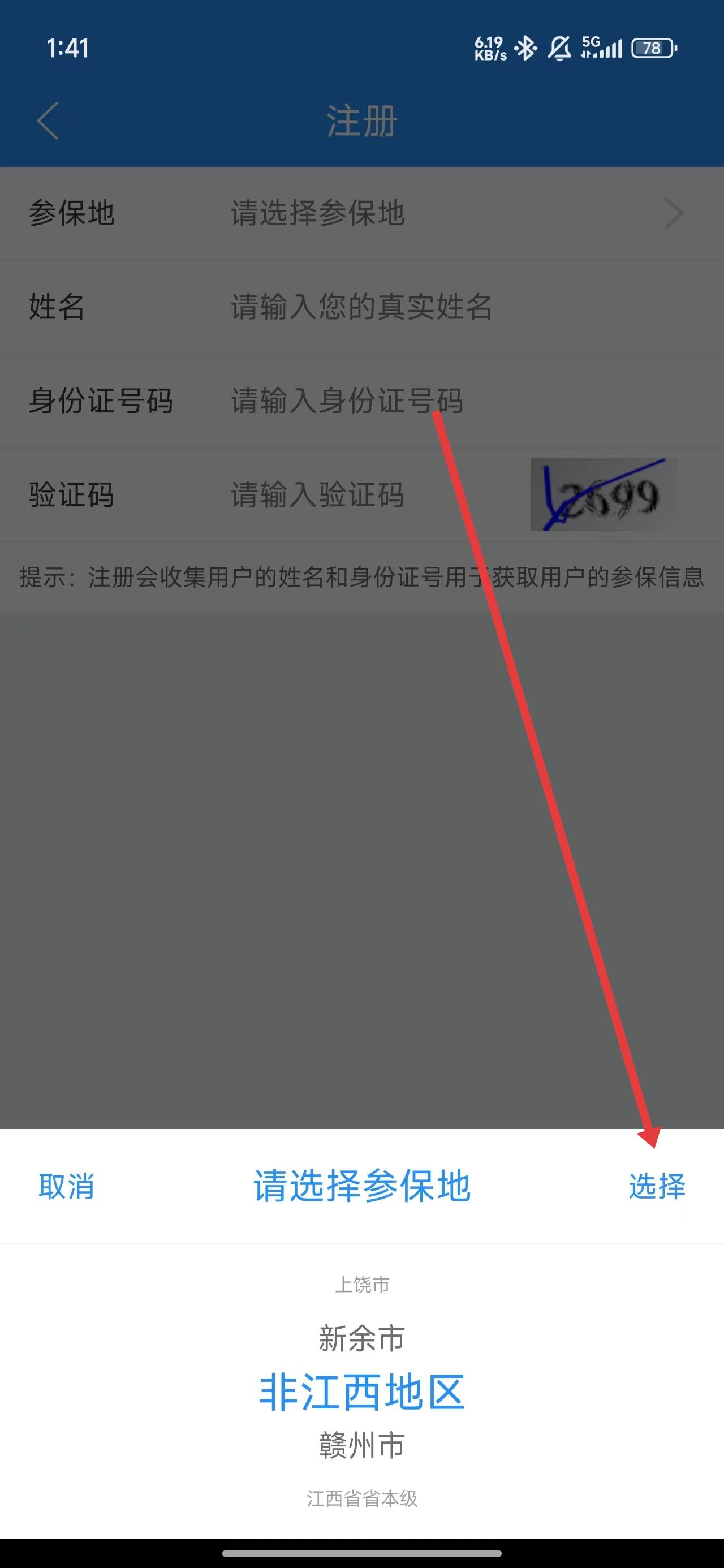 4、在選擇完參保地后,點擊輸入框依次輸入對應(yīng)信息后完成注冊操作。