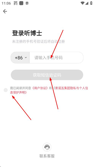2、在登錄頁面輸入手機(jī)號碼,勾選用戶協(xié)議后點擊獲取短信驗證碼,獲取對應(yīng)的驗證碼。