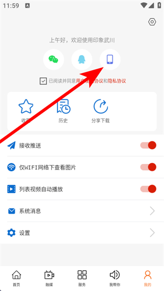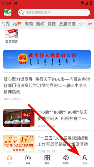 1、打開(kāi)印象武川APP,點(diǎn)擊底部導(dǎo)航欄的我的,進(jìn)入個(gè)人頁(yè)面。