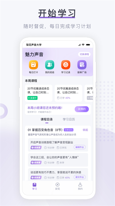 梨花聲音研修院手機(jī)版專(zhuān)注于聲音口才訓(xùn)練學(xué)習(xí)的app平臺(tái),在平臺(tái)上,你可以學(xué)習(xí)發(fā)聲、播音、唱歌等各項(xiàng)技巧,梨花聲音研修院開(kāi)設(shè)了小班視頻教學(xué)供你學(xué)習(xí),每天都有老師免費(fèi)講課,你還可以在app中記錄自己的學(xué)習(xí)天數(shù),記錄自己的成長(zhǎng)哦!