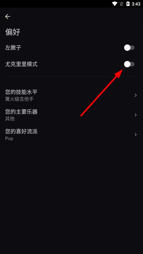 4、在偏好設(shè)置頁面,找到尤克里里模式,點(diǎn)擊其右側(cè)開關(guān)按鈕將其開啟,即可完成尤克里里模式設(shè)置。