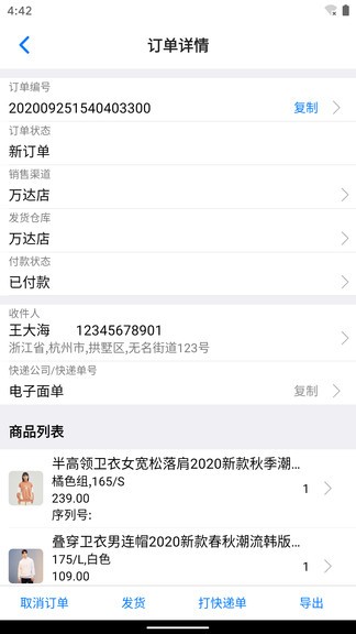 3、可以批量發(fā)貨,也可以掃碼發(fā)貨,發(fā)貨時(shí)可以錄入商品追蹤碼(序列號(hào)),用來(lái)追蹤商品來(lái)源和去向。
