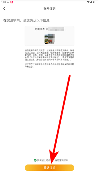 4、仔細閱讀注銷提示信息后,勾選同意相關(guān)條款,再點擊確認(rèn)注銷,按照后續(xù)提示完成賬號注銷操作。