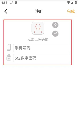 2、在注冊界面上傳頭像,選擇性別,輸入手機號碼和6位數(shù)字密碼。完成信息填寫后,點擊“完成”,