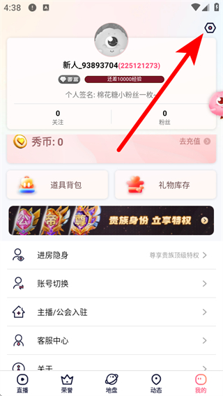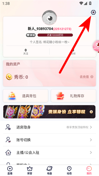 1、打開棉花糖直播APP,點擊右下角我的,進(jìn)入個人頁面后點擊右上角設(shè)置圖標(biāo)。
