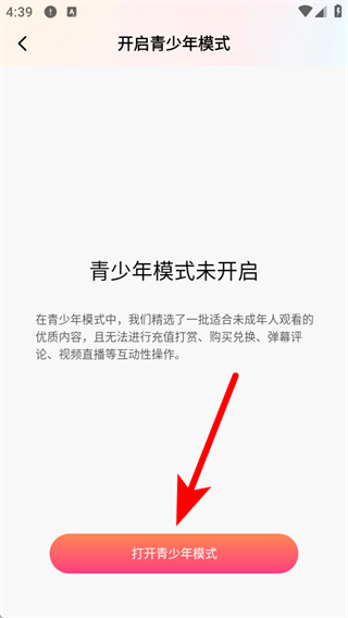 3、在開啟青少年模式頁面中點擊打開青少年模式。