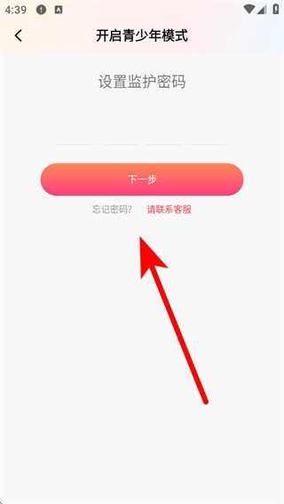 4、進(jìn)入設(shè)置監(jiān)護(hù)密碼頁面,設(shè)置監(jiān)護(hù)密碼后點擊下一步,即可完成棉花糖直播APP青少年模式密碼的設(shè)置。