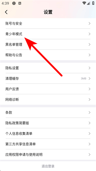 2、在設(shè)置頁面中找到青少年模式選項并點擊,進(jìn)入開啟青少年模式頁面。