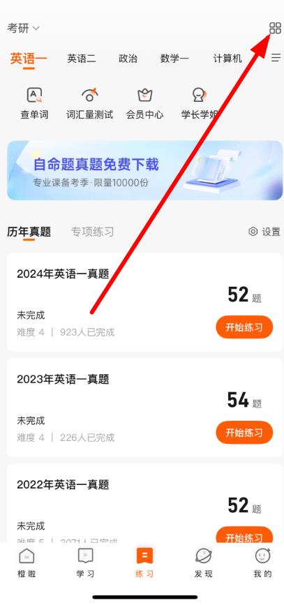 2、在練習(xí)頁面,點擊右上角的九宮格圖標(biāo)。