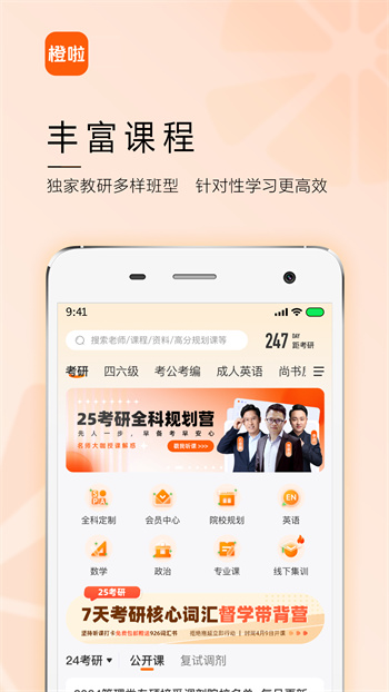 橙啦是一款服務(wù)年輕人的高品質(zhì)學(xué)習(xí)APP,專注于打造大學(xué)英語四六級、考研、實用英語等優(yōu)質(zhì)在線直播課,并提供配套精品學(xué)習(xí)資料。所有課程均由行業(yè)名師坐鎮(zhèn),歷經(jīng)數(shù)年教學(xué)經(jīng)驗打磨,涵蓋所有必考、必學(xué)知識點,已累計幫助數(shù)百萬學(xué)子在考試、在實用英語使用上,獲得重大突破。