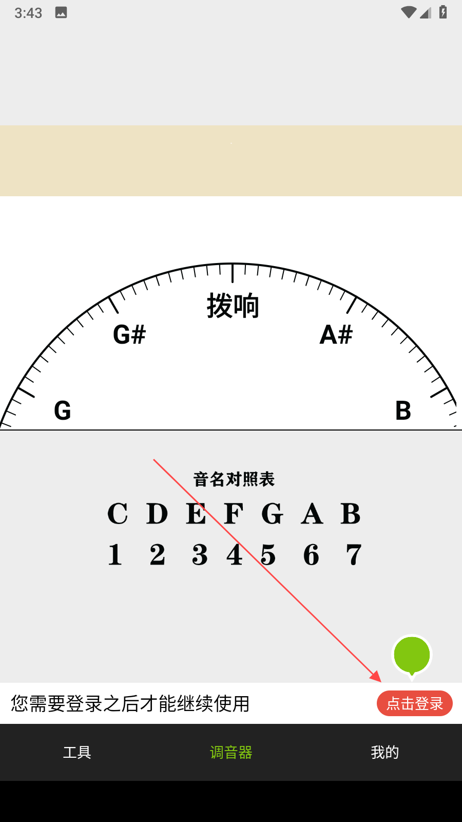 1、打開小熊調(diào)音器app進(jìn)入調(diào)音器界面,若提示登錄點(diǎn)擊登錄按鈕,按指引完成登錄,確保能正常使用全部功能,登錄后在主界面熟悉音名對(duì)照表,明確不同音名對(duì)應(yīng)的數(shù)字標(biāo)識(shí)。