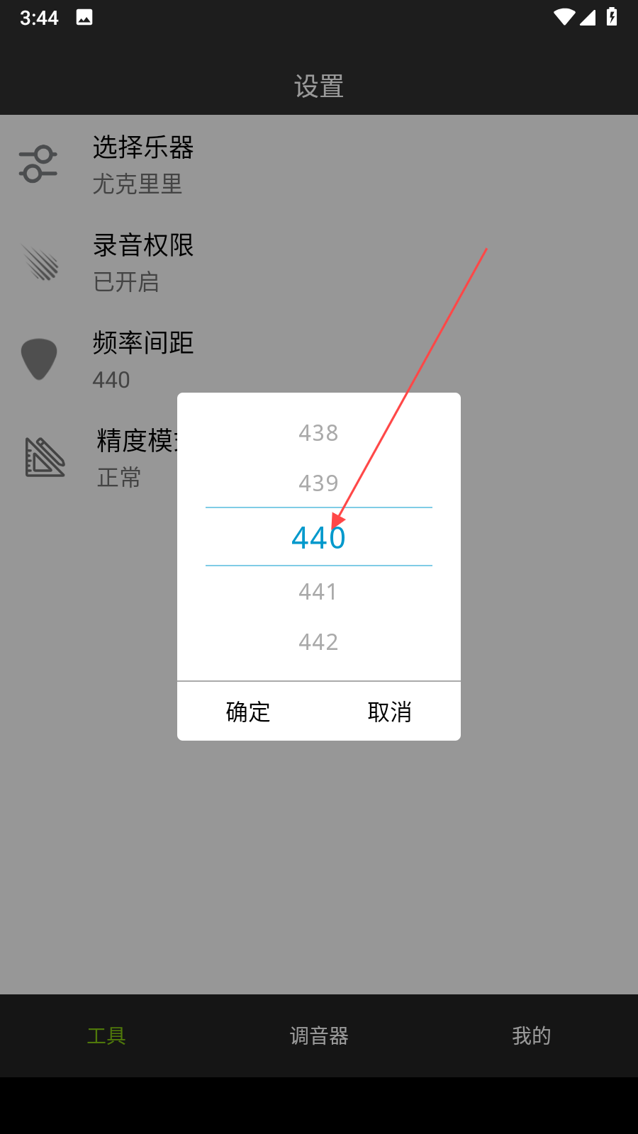 3、在設(shè)置頁(yè)面還能看到頻率間距選項(xiàng),點(diǎn)擊可按需調(diào)整,調(diào)整好樂器和頻率間距等設(shè)置后,回到調(diào)音器界面,撥響樂器琴弦,依據(jù)指針和顯示的音名,轉(zhuǎn)動(dòng)琴弦旋鈕調(diào)節(jié)音高。