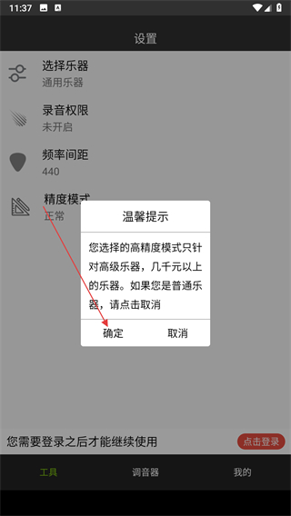 4、在彈出的溫馨提示彈窗中,確認(rèn)自身樂器類型符合要求后,點(diǎn)擊確定按鈕。