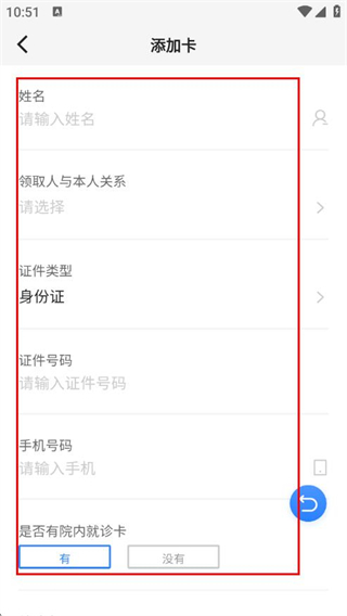 3、在添加卡頁面填寫姓名、領(lǐng)取人與本人關(guān)系、證件類型、證件號(hào)碼、手機(jī)號(hào)碼,選擇是否有院內(nèi)就診卡。