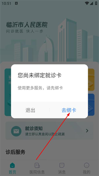2、在彈出的您尚未綁定就診卡提示框中,點(diǎn)擊去綁卡。