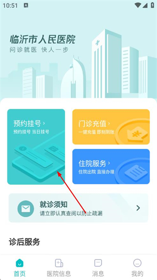 1、打開臨沂市人民醫(yī)院APP,在首頁點(diǎn)擊預(yù)約掛號(hào)。