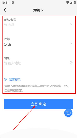 4、在添加卡頁面繼續(xù)填寫就診卡號(hào)、民族、地址,確認(rèn)信息無誤后,點(diǎn)擊立即綁定,即可完成就診卡綁定。