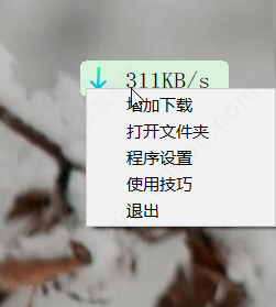 (2)其窗口是一個(gè)下載速度顯示懸浮小控件,用于實(shí)時(shí)查看當(dāng)前的下載速度和對(duì)下載器進(jìn)行簡(jiǎn)單的設(shè)置(右鍵單擊可以彈出菜單),比如下載/上傳限速,開(kāi)機(jī)自啟,下載完成自動(dòng)關(guān)機(jī)、BT trackers設(shè)置等等