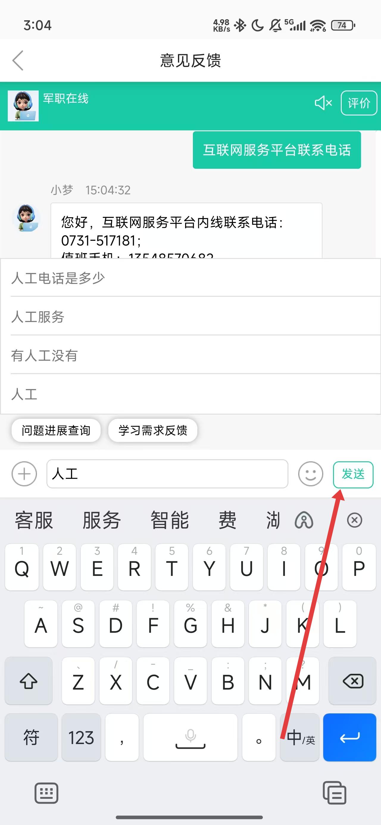 3、進入到客服意見反饋頁面后,輸入人工并發(fā)送,即可跳轉人工頁面進行反饋問題操作。