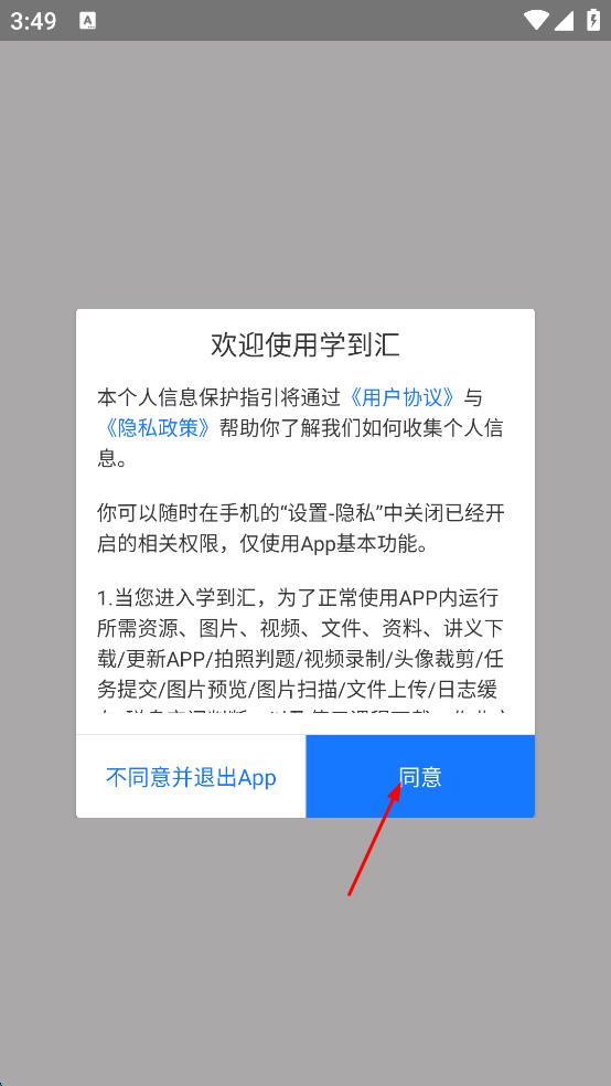 1、打開學(xué)到匯APP,會出現(xiàn)歡迎使用學(xué)到匯的提示頁面,仔細(xì)查看后,點擊“同意”按鈕,進(jìn)入登錄頁面。