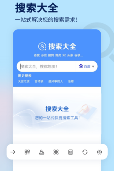 搜索大全app是一款搜索聚合軟件,將多個(gè)搜索引擎聚合在本產(chǎn)品中,切換方便,滿足多種搜索需求。集合百度、搜狗、360、神馬、頭條、必應(yīng)、雅虎、谷歌等國內(nèi)外主流搜索引擎。操作簡單,快捷方便,一站式搜索??焖偎阉鳎绘I切換搜索引擎,搜索全網(wǎng)文字、圖片。