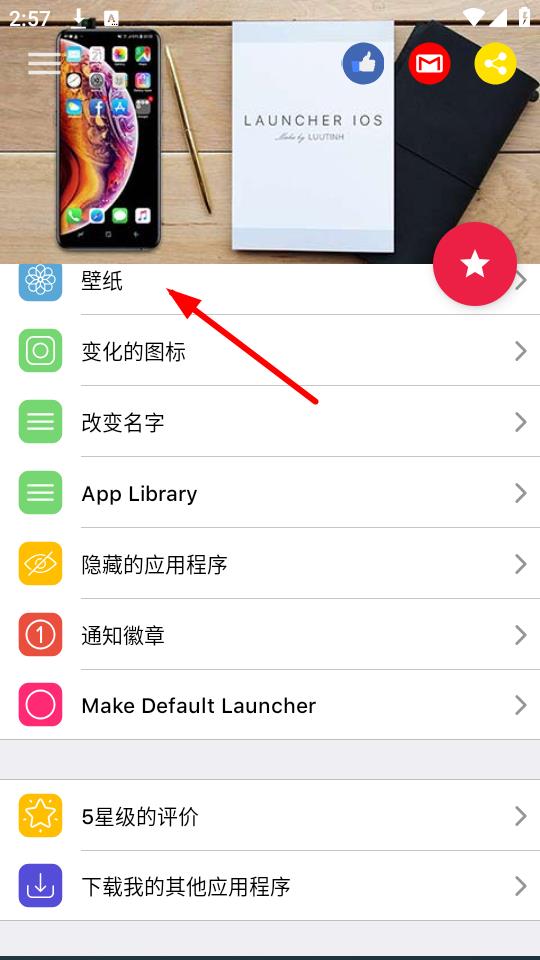 1、打開ios launcher應(yīng)用,在主界面點擊壁紙選項,準備更換桌面壁紙。