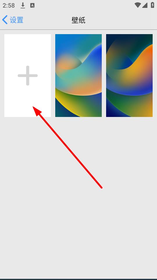 2、進入壁紙設(shè)置頁面,點擊帶有加號的區(qū)域,選擇添加新壁紙。