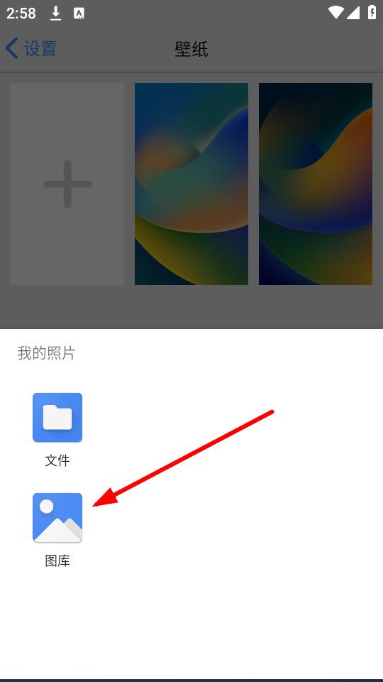 3、在彈出的選項中,點擊圖庫,從手機相冊里選取想要設(shè)置為壁紙的圖片。