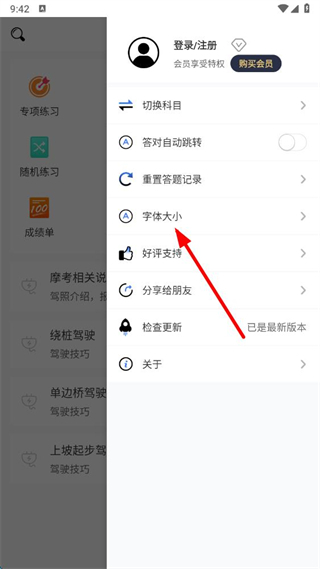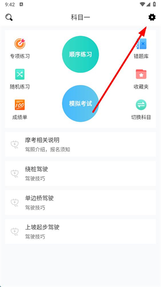 1、在摩托車駕照考試app界面,點擊右上角設置圖標,進入設置菜單。
