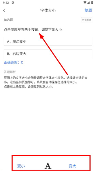 3、在字體大小設置界面,點擊底部變小或變大按鈕調整字體大小。
