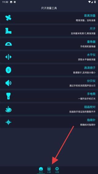 1、啟動尺子測量工具APP,在首頁內(nèi)點(diǎn)擊下方導(dǎo)航欄中計算的圖標(biāo)。