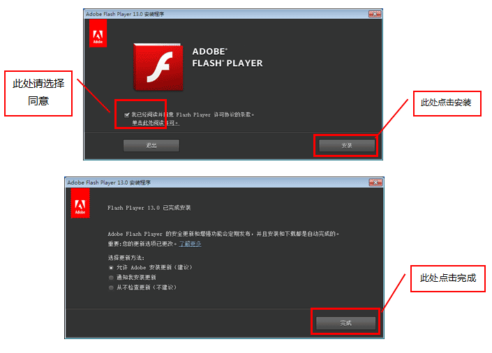 3) 在軟件安裝過程中會彈出提示頁面要求安裝FLASH組件。請?jiān)谔崾卷撁嬷邢冗x擇同意,然后點(diǎn)擊安裝,F(xiàn)LASH完裝完畢后點(diǎn)擊完成,繼續(xù)下一步安裝。