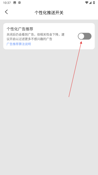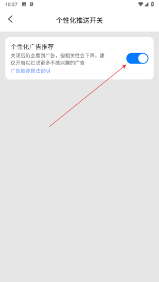 4、點(diǎn)擊個(gè)性化廣告推薦右側(cè)的開(kāi)關(guān)按鈕,將其切換為開(kāi)啟狀態(tài),即可開(kāi)啟個(gè)性化推薦。