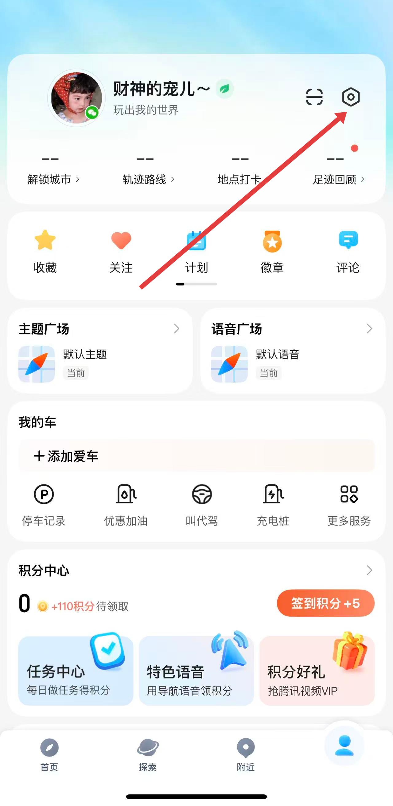 1、打開騰訊地圖APP,點擊右下角我的,進(jìn)入個人頁面后,點擊右上角的設(shè)置圖標(biāo)。