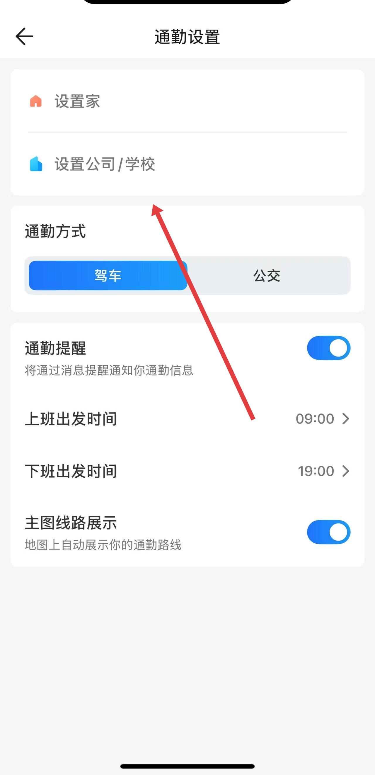 3、在通勤設(shè)置頁面,點擊設(shè)置家或設(shè)置公司/學(xué)校,輸入對應(yīng)的地址;還能選擇通勤方式,設(shè)置通勤提醒的出發(fā)時間,以及決定是否開啟主圖線路展示。