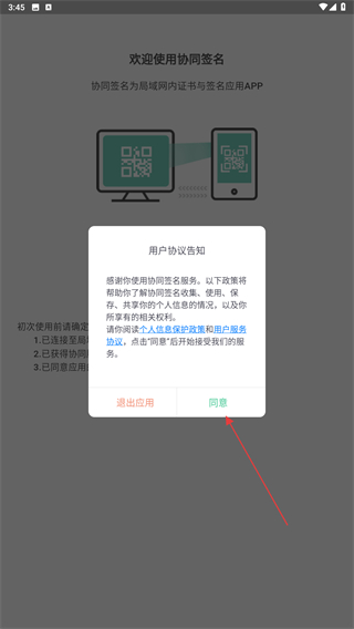 1、打開協(xié)同簽名APP,進入時會彈出用戶協(xié)議告知,了解后點擊同意的按鈕。