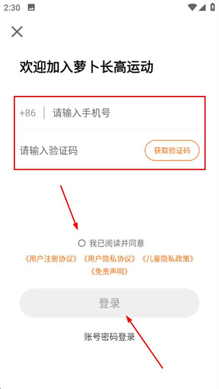 3、輸入手機(jī)號(hào)和收到的驗(yàn)證碼,勾選后點(diǎn)擊登錄,新用戶(hù)自動(dòng)完成注冊(cè)。