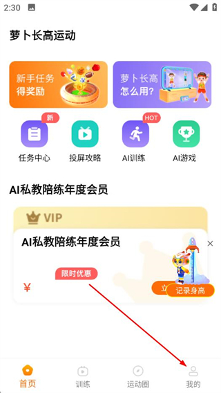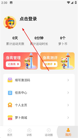 1、打開(kāi)蘿卜長(zhǎng)高運(yùn)動(dòng)APP,點(diǎn)擊底部我的。