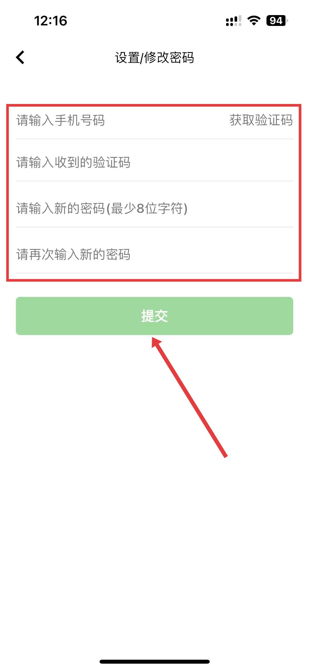 5、按提示輸入手機(jī)號(hào)碼并獲取驗(yàn)證碼,再設(shè)置新密碼,點(diǎn)擊提交即可完成密碼修改。