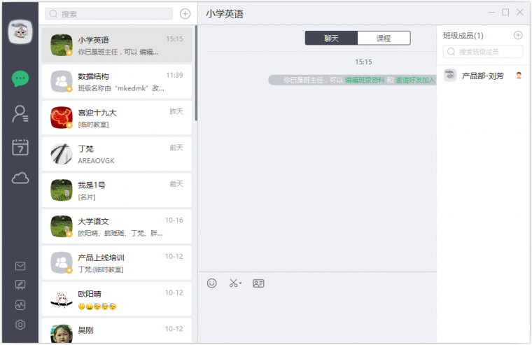 默認(rèn)進(jìn)入聊天界面,聊天界面右邊是公告欄。左側(cè)功能分區(qū)分別為【聊天】、【好友】、【課程】、【云盤】。