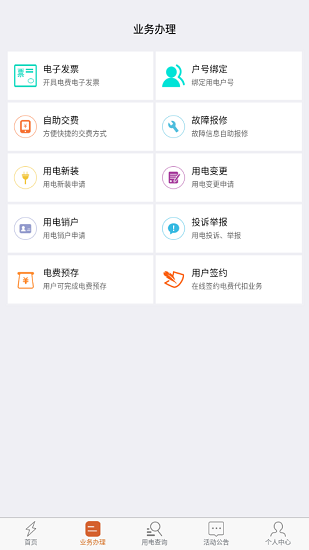 用電客戶綁定用電戶號后可進(jìn)行用電業(yè)務(wù)辦理,包括用電新裝、用電變更、用電銷戶、故障報(bào)修、辦理進(jìn)度查詢;用電信息查詢包括,電價(jià)信息查詢、電費(fèi)賬單查詢,繳費(fèi)記錄查詢、當(dāng)前欠費(fèi)信息查詢,用電繳費(fèi)等功能。